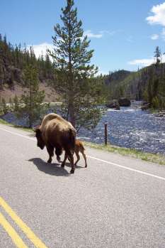 Minutes after we entered the park we encountered a mother buffalo and her baby jogging in the road. We began to see the landscape change as we moved through old burned forests and lush fields filled with buffalo and elk.