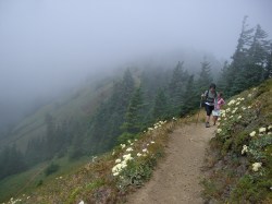 As we approached the 3 mile marker we began to see clouds rushing by all around us. The woods were wet, and even though there had been no forecast of rain, the plants were covered in droplets from the passing clouds.