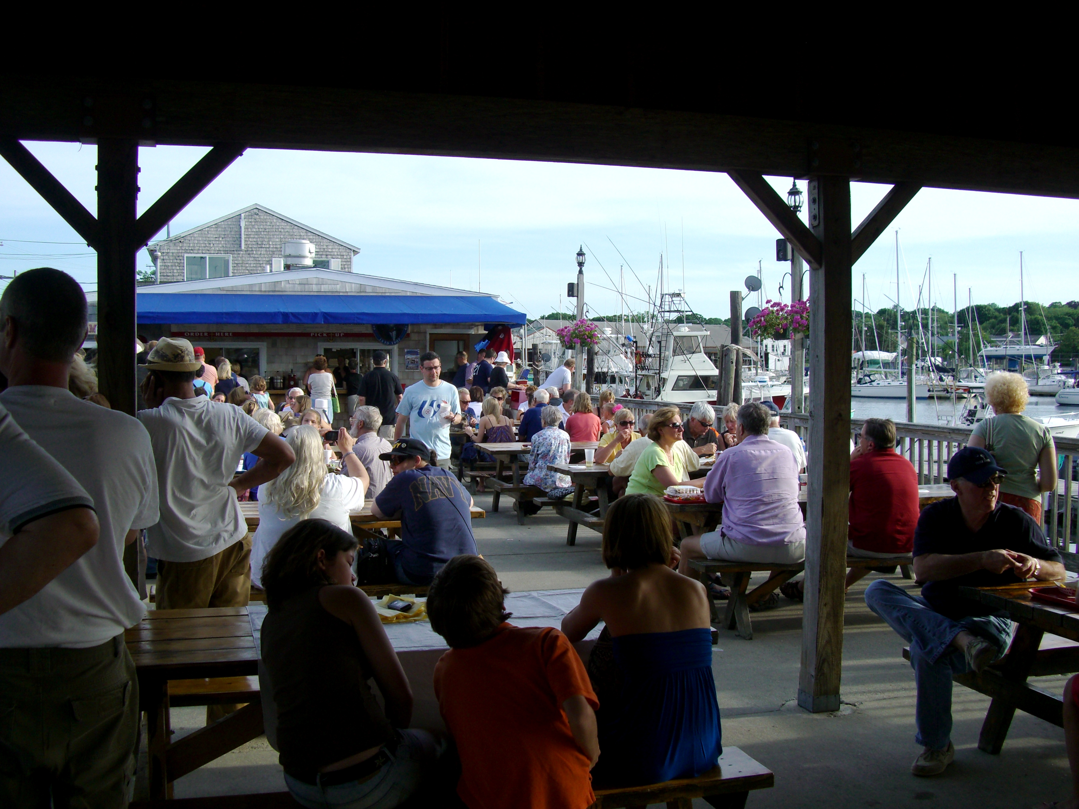 We drove down the narrow gravel road into a large, packed parking area. Then we saw the lobster pots, picnic tables, and finally the place we were looking for. The line was at least a couple hundred people deep, and the dining was very unique. There were no waitresses or waiters: you just stand in line, order, take your number, and find a seat or place to stand. They call you and you eat. Dozens of familiar customers came prepared with picnic baskets, plates, tablecloths, and their own silverware. Tons of families were there and even though there were lots of seats, they were nearly all full with hungry diners.