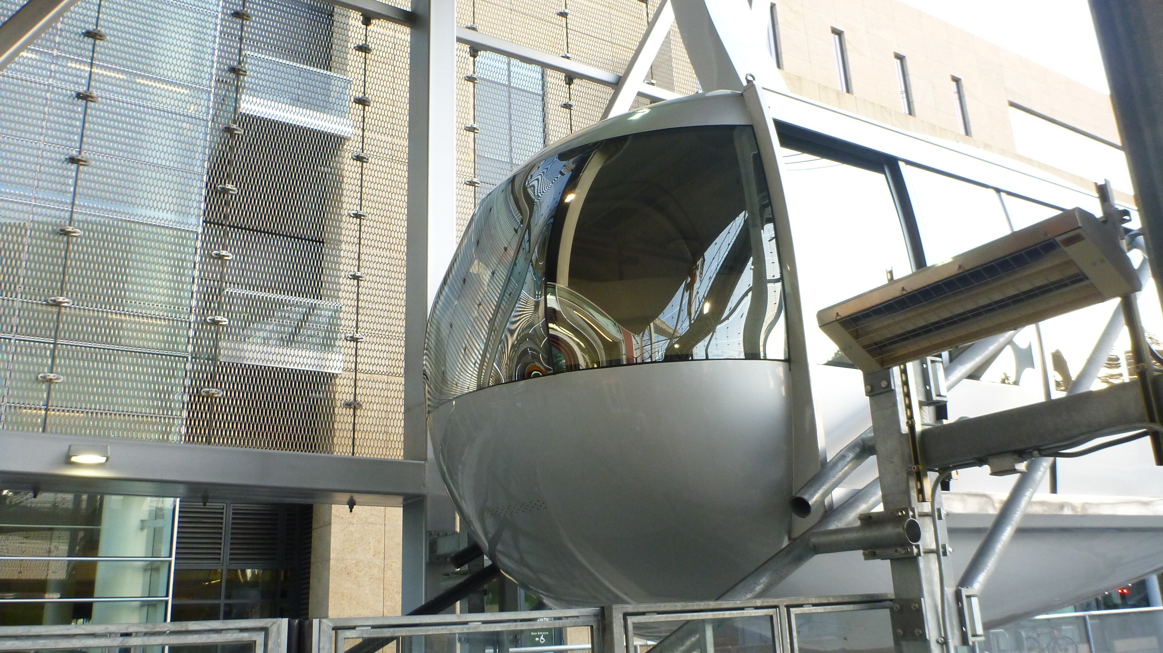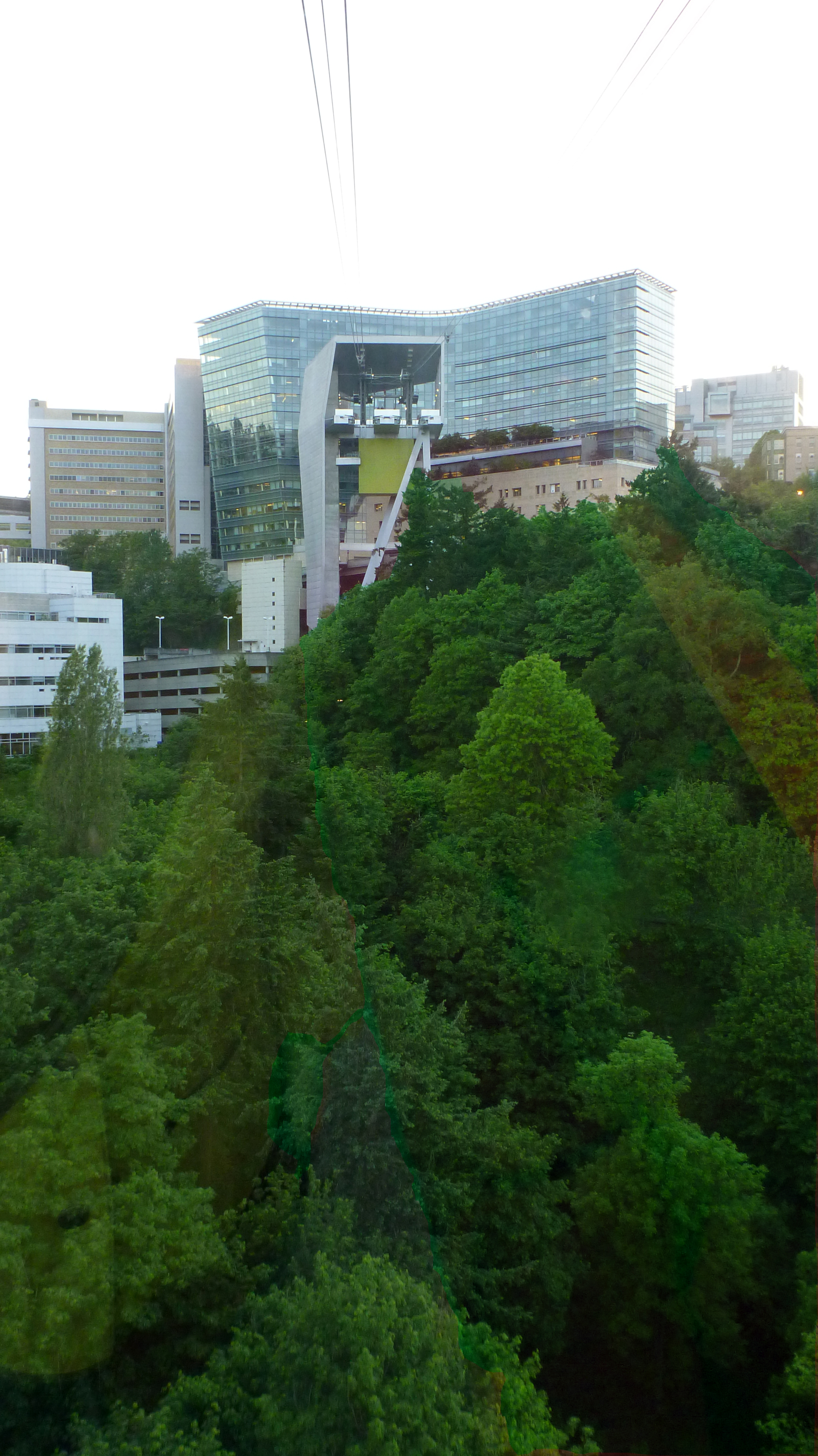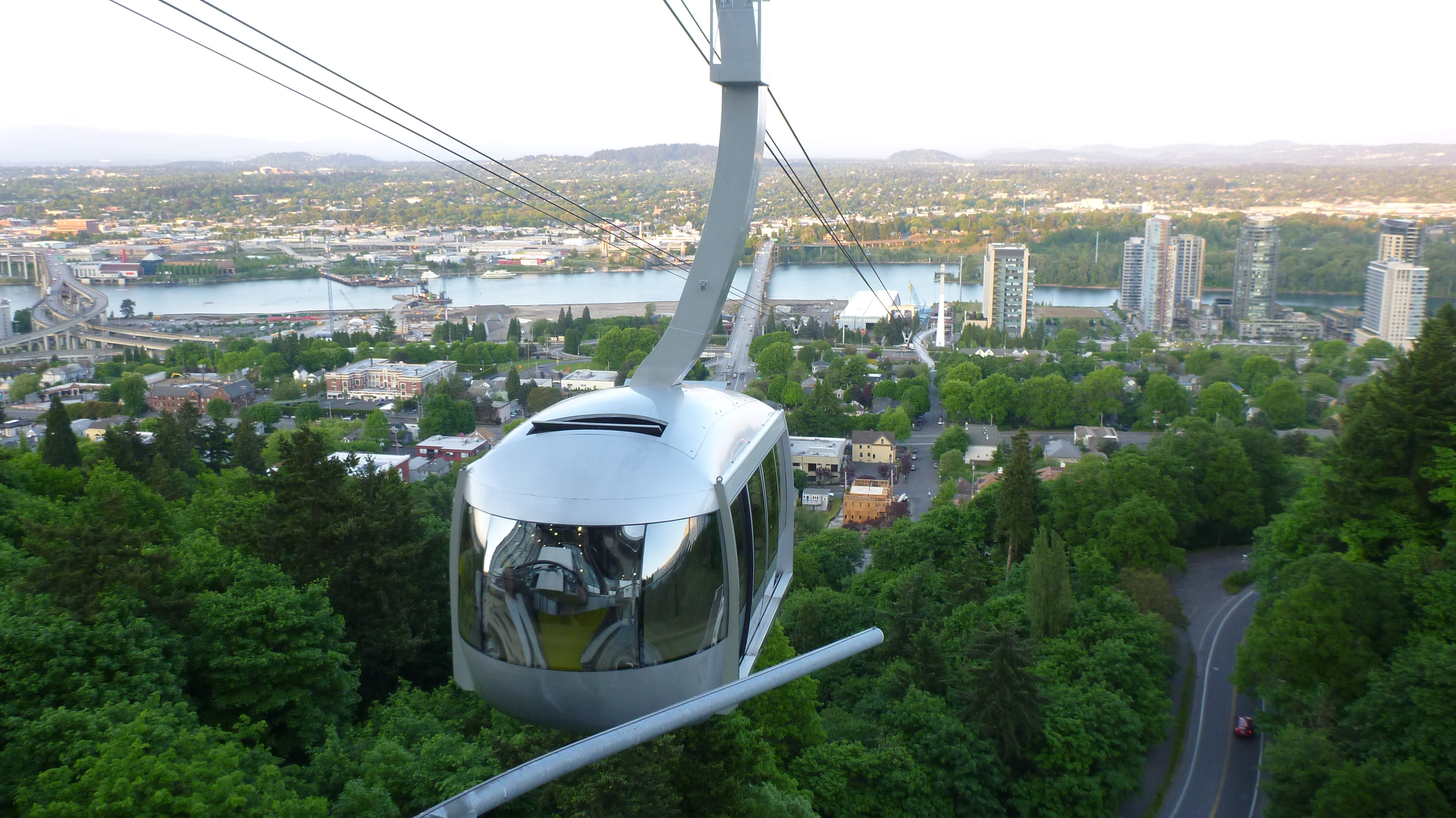 The project was designed by Angelil/Graham/Pfenniger/Scholl, based in Zurich, Switzerland, and Los Angeles. The custom-designed cabins were made by Gangloff Cabins of Bern, Switzerland. Seeing the silver bullet-like Tram cruise overhead feels a little like spotting a flying saucer. From inside the bullet, the view is amazing. It might be the only place in the city that has such a wonderful vista view of the river and the downtown area.
