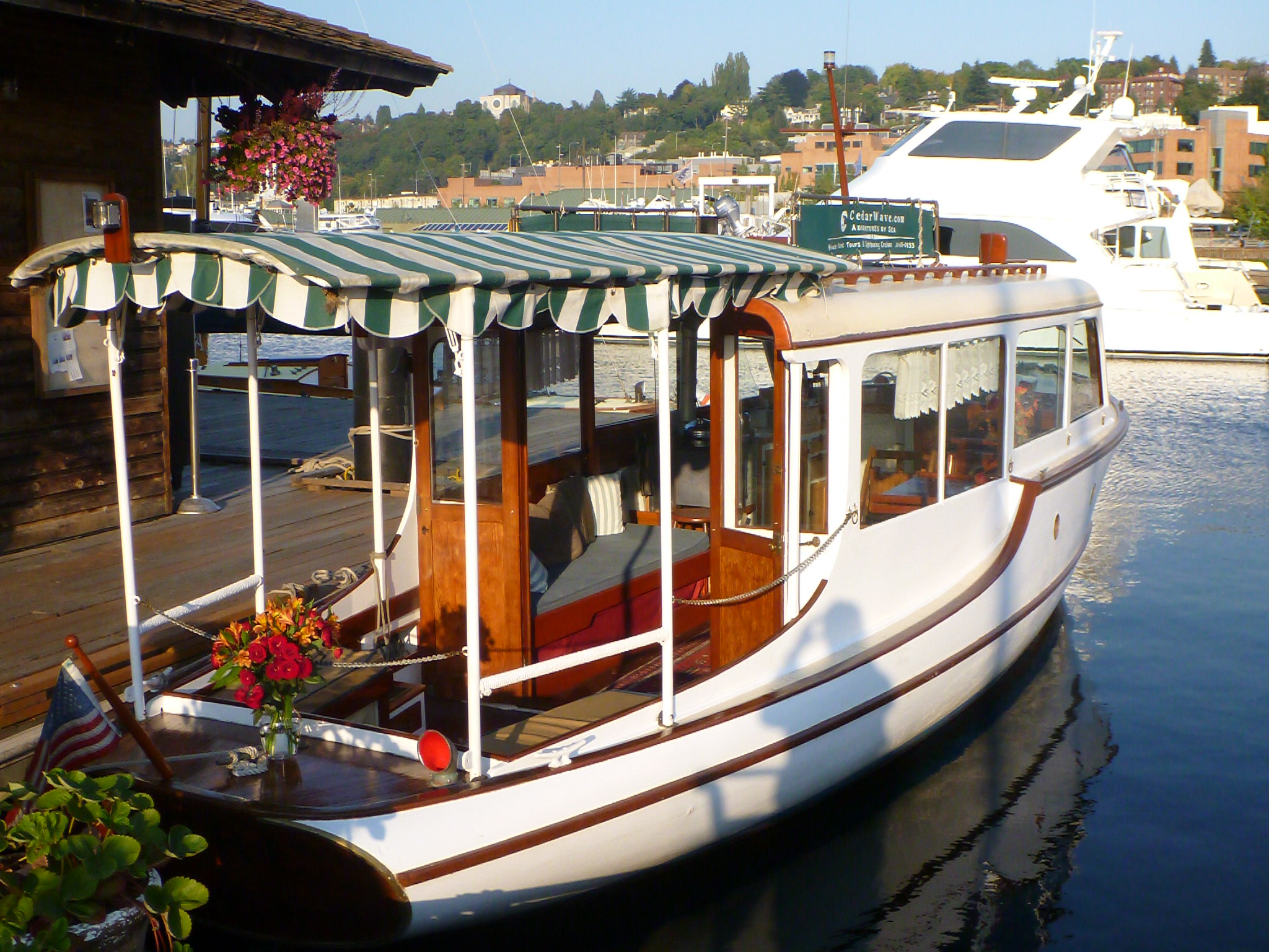 Lake Union tour boat at Center for Wooden BoatsThe center houses hundreds of unique wooden boats: some that acted like lake food carts, others that have steam motors, and several rental boats as well. The center offers free boat rides around the lake each Sunday, but be sure to get there early as it is first come first serve. There is an exhibit area in the main building, but visiting the Boat Center itself is a maritime experience. To me, it was a living museum of boat history. As you pass the first building, you can see that all the buildings there were hand crafted from beautiful wood. In fact, one building was built specifically for members to use as a space to build boats. There is a woodworking shop where you can watch the young workers create and repair wooden boats. Most boats docked in the museum are privately owned, but some are for sale to those who want their own lake adventures.